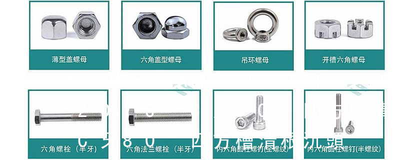 1、Flat:平頭 (鎖入后,頂部與工作件齊平)2、Oval:色拉頭、O頭、半沉頭 3、Round:圓頭 4、Pan:圓扁頭 5、Truss:大圓扁頭 6、Hex:六角頭 A-5:Finish Code/外觀處理。公制自攻螺絲 :于品名后方直接標示 Tapp 主要分類包括普通螺絲、機螺絲、自攻螺絲和膨脹螺絲三種。 有頭螺釘Cap screw 過去限于全牙的扣件。 六角頭螺釘Hex cap screw與大六角螺栓Hex bolt 顧名思義為頭部為六角型的外螺紋扣件,設計為使用扳手轉動。依照ASME B18.2.1標準,六
